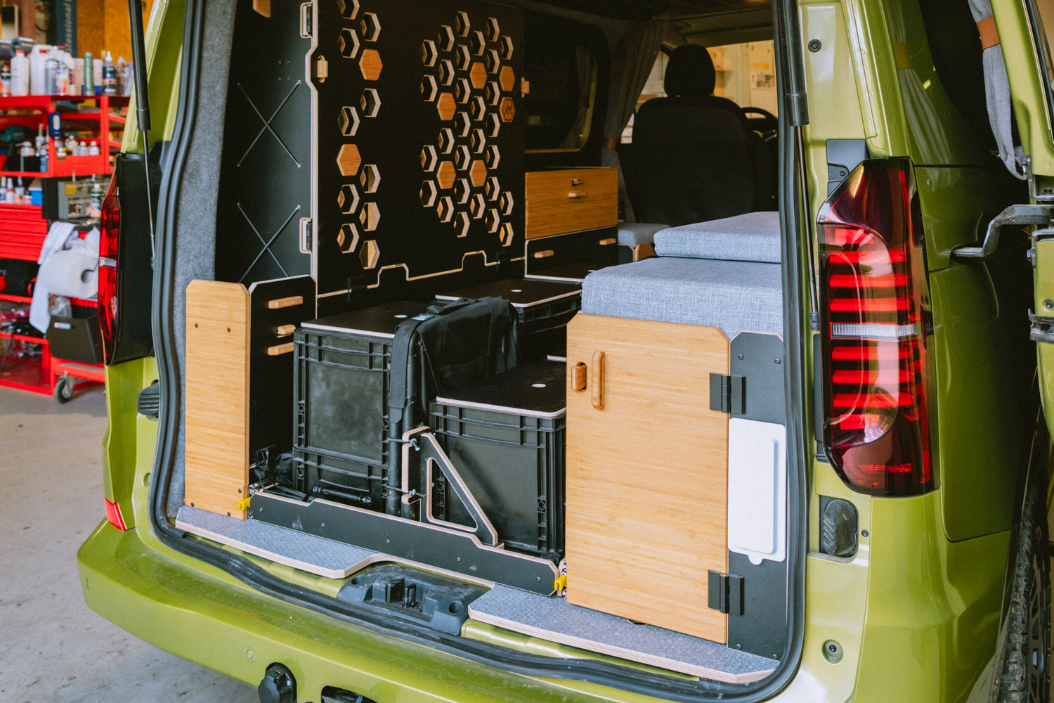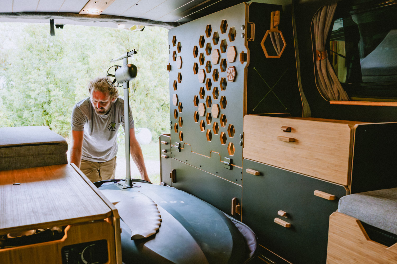 Avec l’aménagement OUEST, chaque arrêt devient une expérience. Un véritable campement mobile qui incarne la philosophie Van Mania : prendre le temps de la découverte.