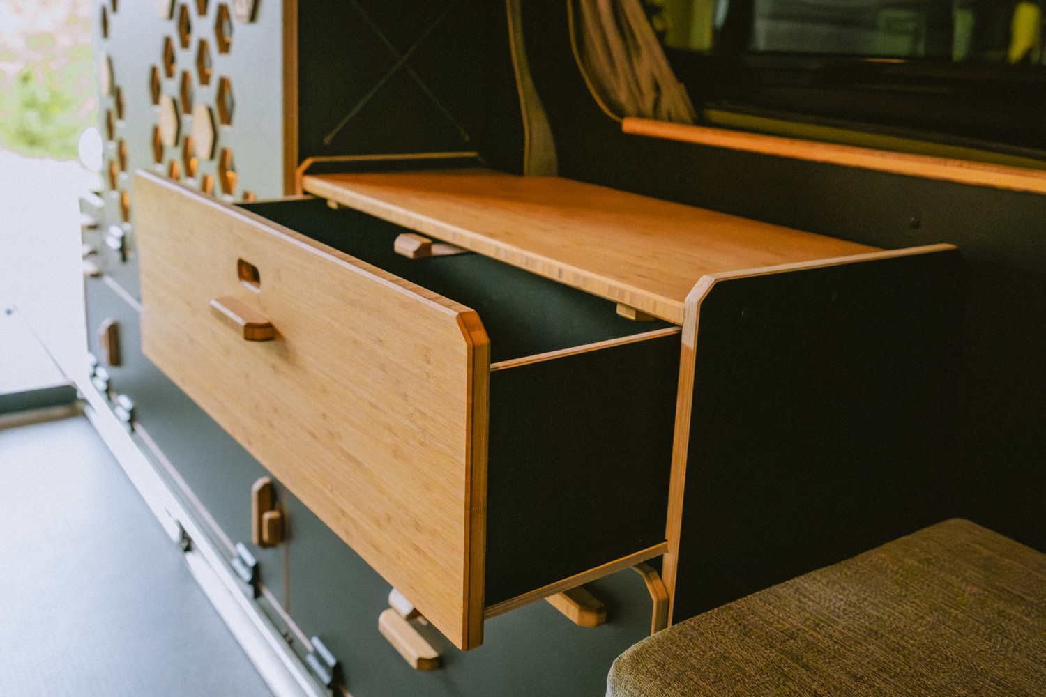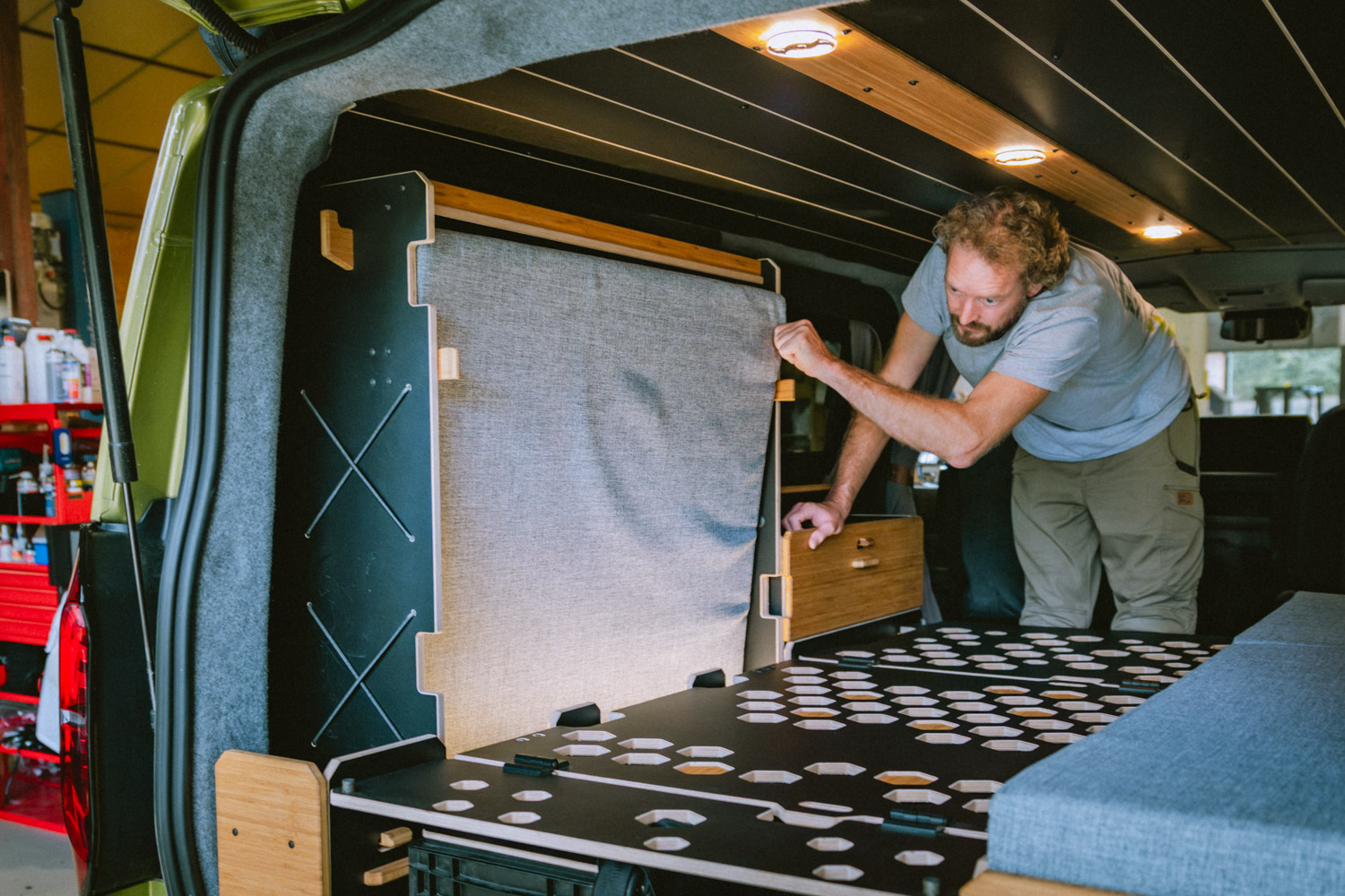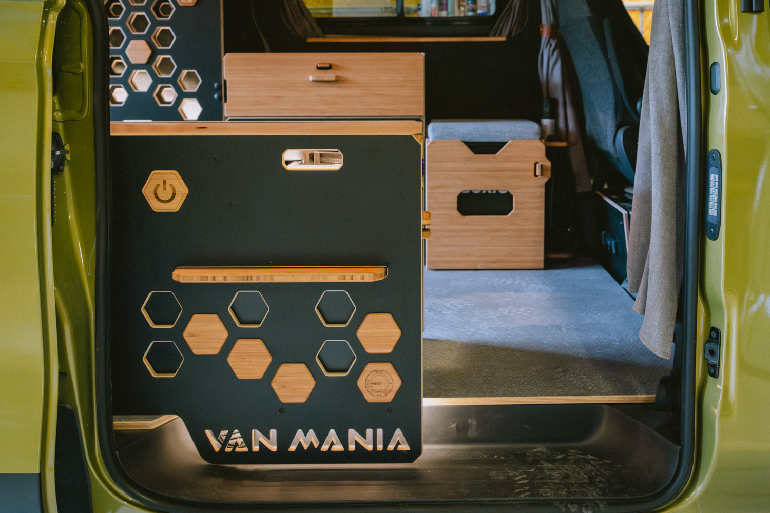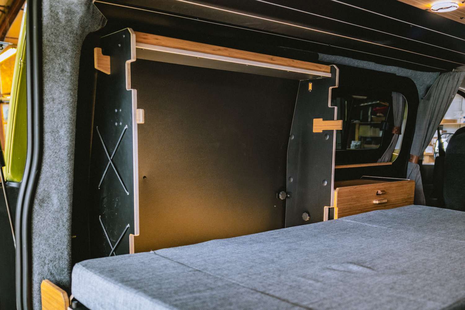 Disponible en blanc/bambou ou noir/bambou, le mobilier est conçu pour durer. Les gâches en bambou massif pour verrouiller les parties mobiles (portes, etc.) permettent d’assurer la résistance dont on a besoin lors de son road trip. Ce choix esthétique et durable renforce la philosophie Van Mania : offrir un mobilier robuste, fonctionnel et garanti à vie.