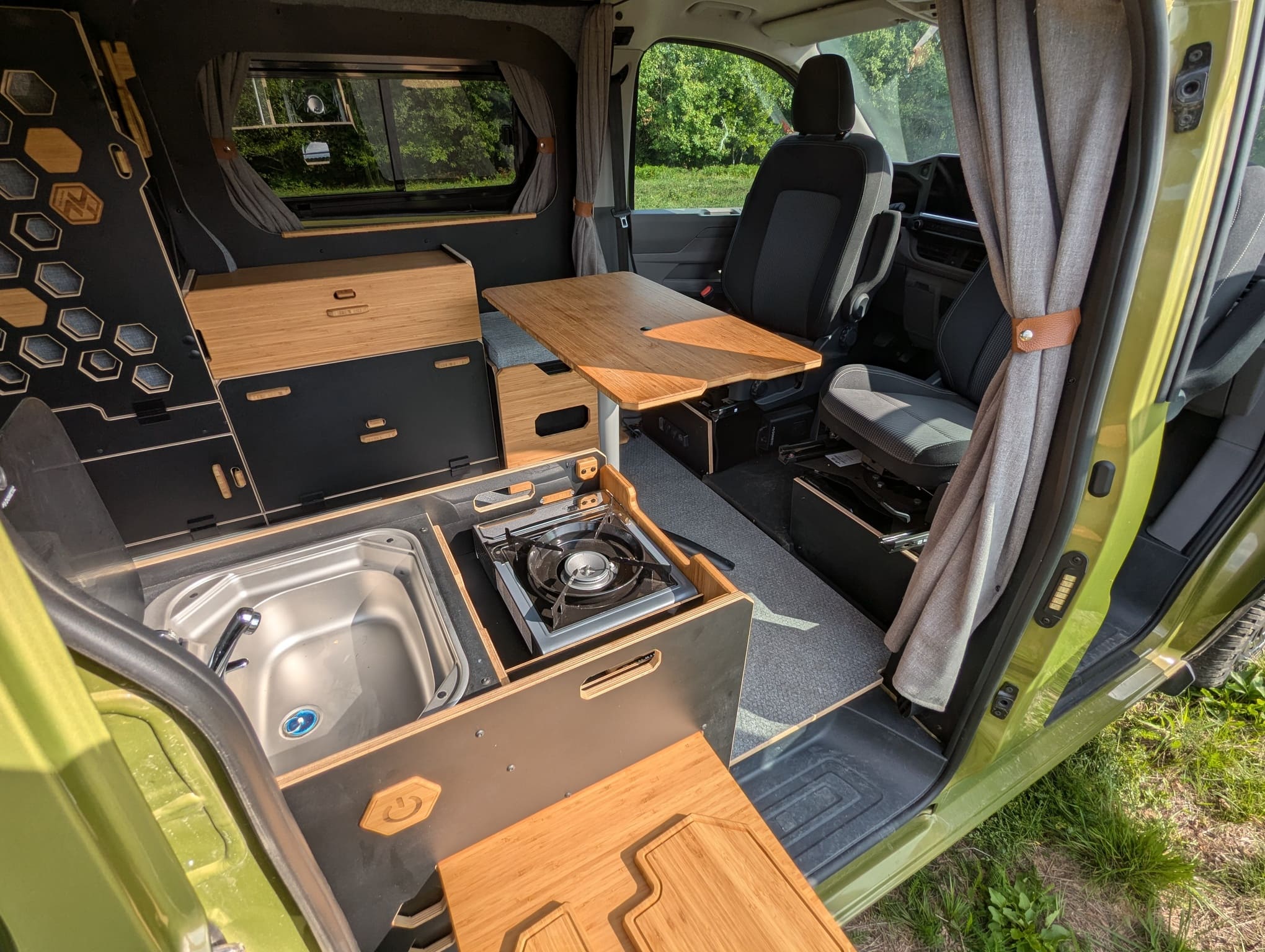 Cuisine équipée avec un évier en inox, une pompe à eau et un robinet, un réchaud autonome et portatif intégré, des espaces de rangement, un emplacement pour réfrigérateur, ainsi qu’un éclairage indirect lorsque la batterie secondaire est choisie en option.