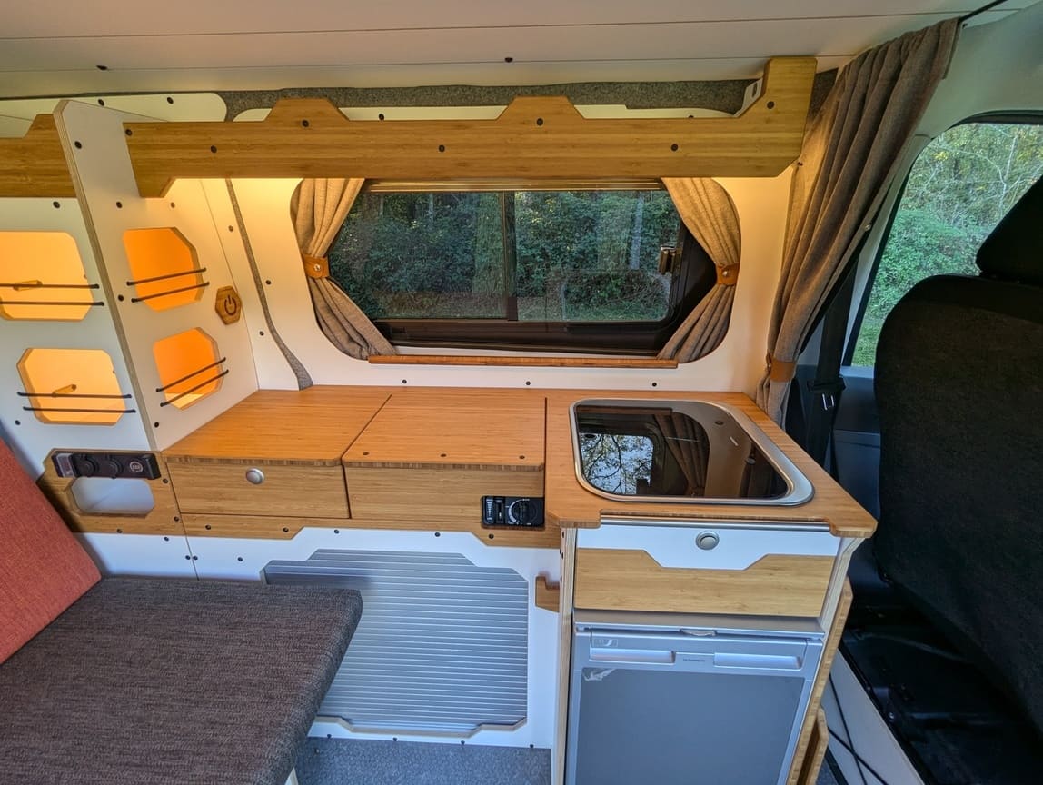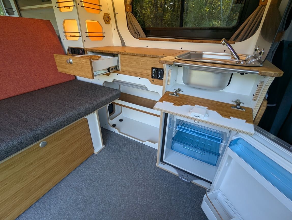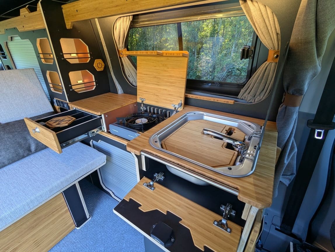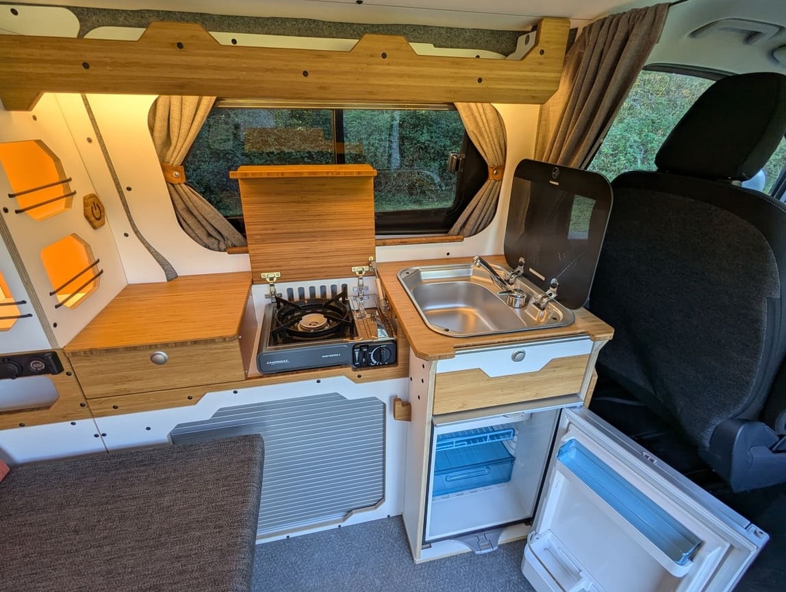 Le meuble cuisine est équipé avec un évier inox, une pompe à eau et un robinet, un réchaud autonome et portatif intégré, ainsi que plusieurs espaces de rangement. Il est conçu avec un emplacement pour recevoir un réfrigérateur façade Dometic en option.