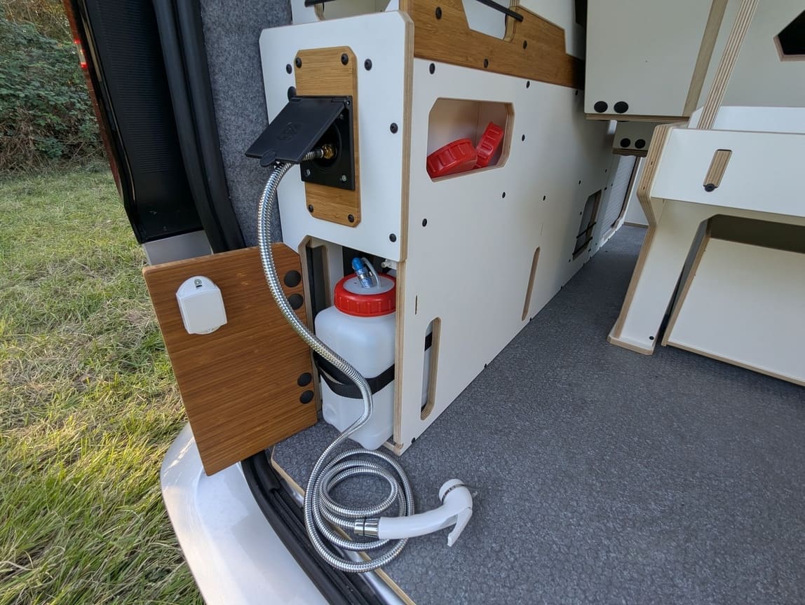 Ce meuble vient recevoir deux bidons d’eau, un pour l’eau usée, l’autre pour l’eau propre, des raccords rapides sont prévus afin de faciliter le démontage. Il comprend un emplacement pour recevoir les équipements des options kit batterie secondaire, et eau chaude.