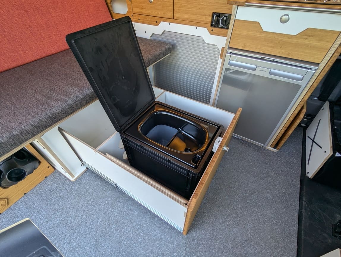 Une toilette à séparation au format parfait de l’Eurobox avec des dimensions de 400 x 300 x 280 mm (L x l x H avec couvercle). La toilette BOXIO trouve sa place dans certain de nos aménagements.