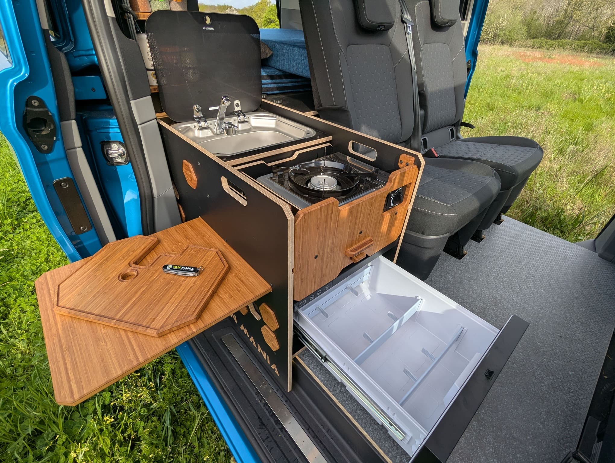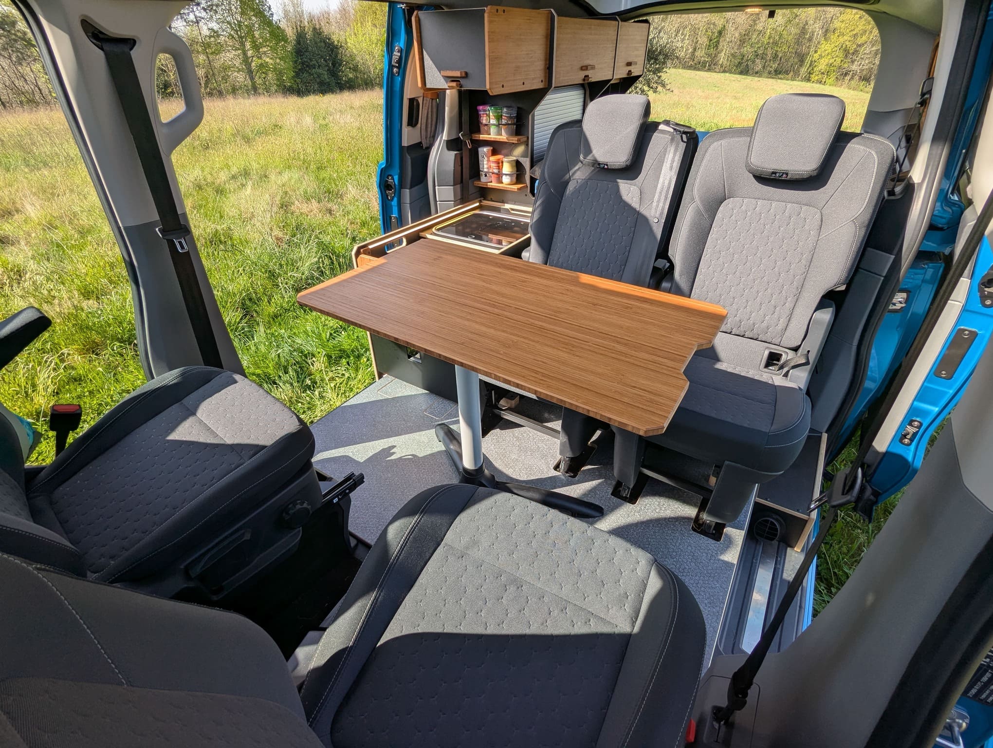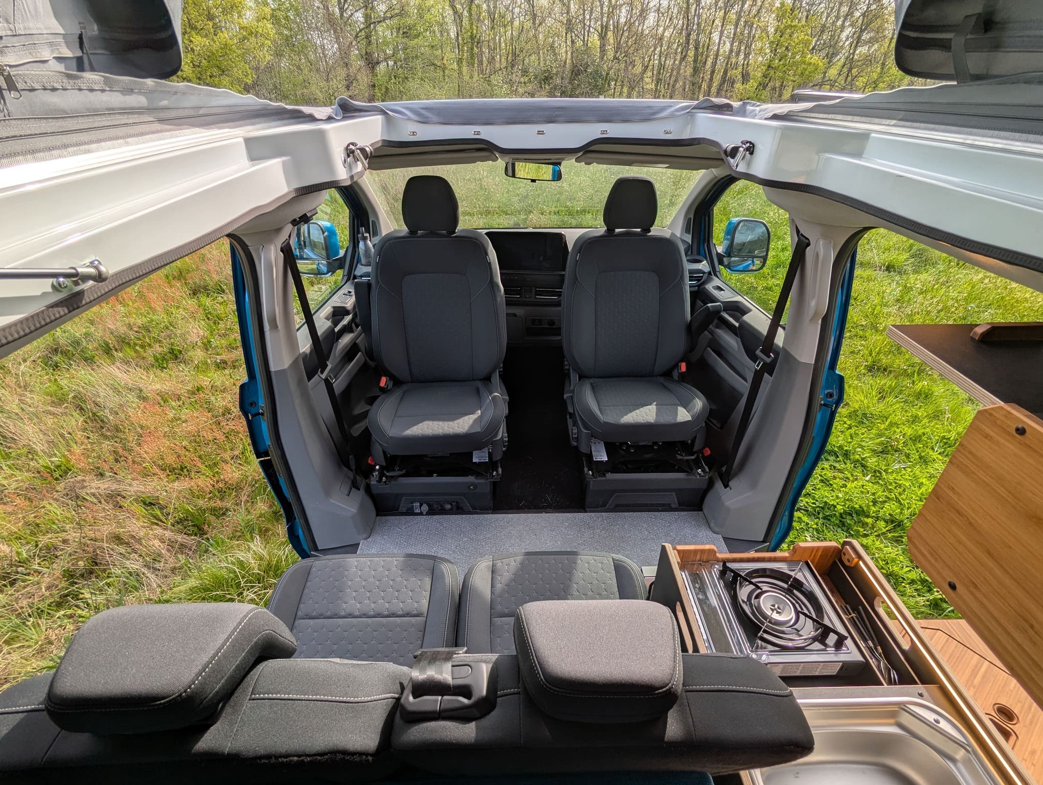 Il permet d’avoir un coin cuisine accessible de l’intérieur comme de l’extérieur, un plus non négligeable pour les amoureux du plein air. Il a su convaincre au fil des années de nombreux adeptes du voyage en van. Il est prévu pour idéalement voyager en famille ou entre amis avec ces 4 ou 5 places route.