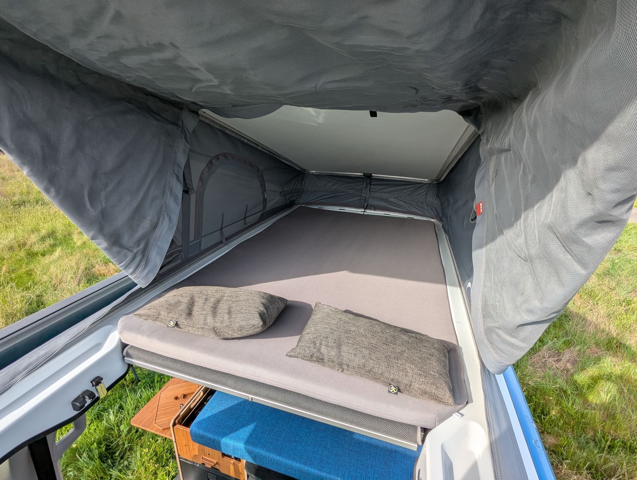 Pose de toit Relevable SCA, avec couchage sur vérin comprenant une sommier à plots confort, matelas à mémoire de forme de 4cm houssé. La finition du plafond et l’intégration de luminaire LED dans le toit est aussi compris.