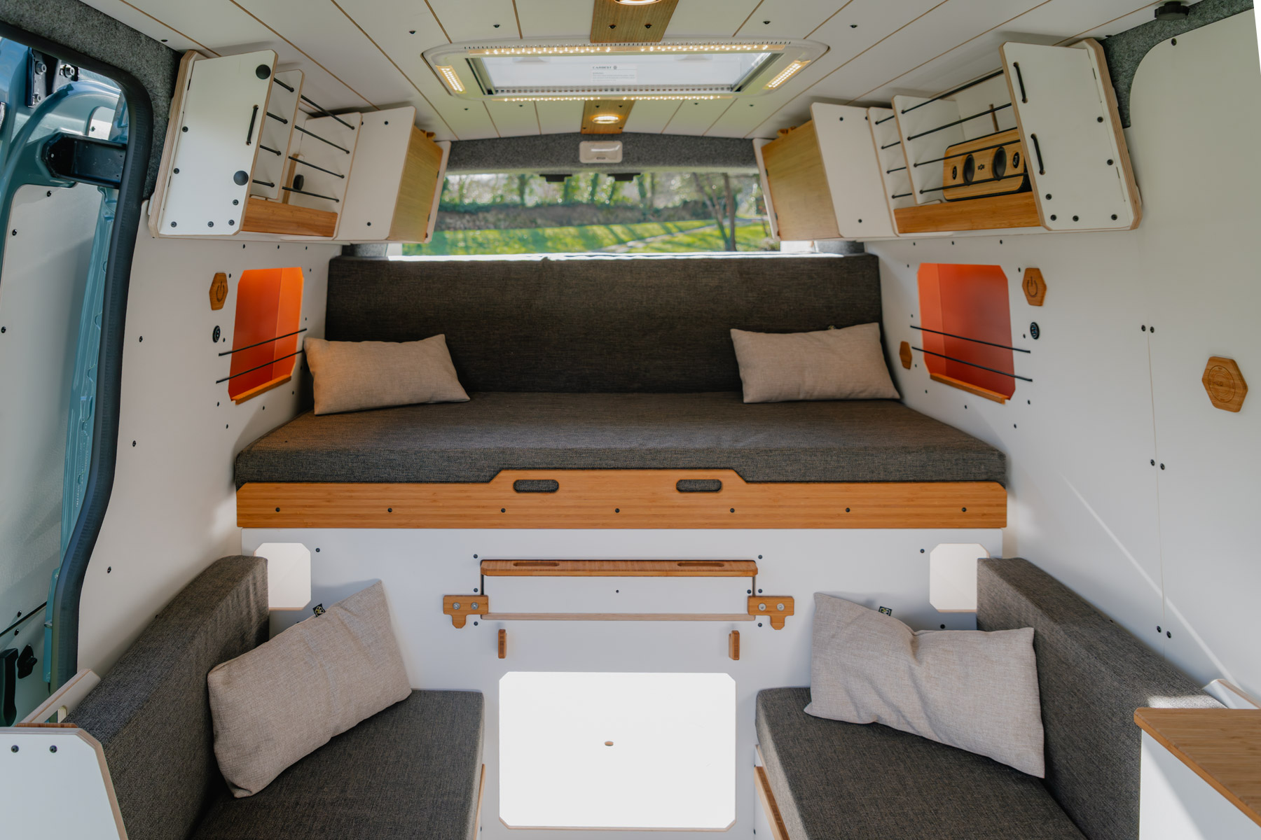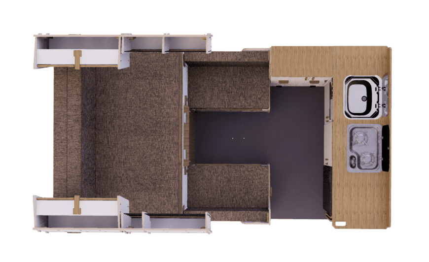 Ces assises intègrent également des volumes de rangement pratiques. L’une d’elles dispose d’un tiroir pouvant accueillir des toilettes chimiques ou sèches. Ce tiroir peut également servir de marche pour faciliter l’accès au grand couchage double.